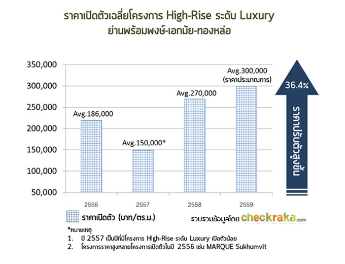 จากข้อมูลในตารางจะเห็นได้เลยว่าราคาเปิดตัวคอนโดหรูย่านนี้ราคาไม่เบาเลย ซึ่งแนวโน้มราคาคอนโดที่ขึ้นไปนี้ก็ไม่ใช่เรื่องแปลกค่ะ เพราะราคาที่ดินปัจจุบันแถวถนนใหญ่สุขุมวิทก็เริ่มต้นกันที่ 1.2-1.9 ล้านบาท/ตร.ว. กันเป็นอย่างต่ำหมดแล้ว หรือแม้กระทั่งในซอยอย่างทองหล่อก็เปิดราคาขายกันสูงถึง 1.9 ล้านบาท/ตร.ว. แล้ว และในปี 2559 นี้ ราคาประเมินที่ดินรอบใหม่ก็เริ่มมีผล โดยราคาประเมินที่ดินในพื้นที่กรุงเทพฯ ก็เพิ่มขึ้นเฉลี่ยถึง 15.78% ในขณะที่ปัจจุบันที่ดินเกาะแนวรถไฟฟ้าถนนสุขุมวิทมีการปรับตัวสูงกว่า 15-20% ต่อปี ทางทีมงานได้ทำกราฟแสดงราคาเปิดตัวเฉลี่ยของโครงการคอนโด High Rise ระดับ Luxury ในย่านสุขุมวิทมาให้ดูกันค่ะ