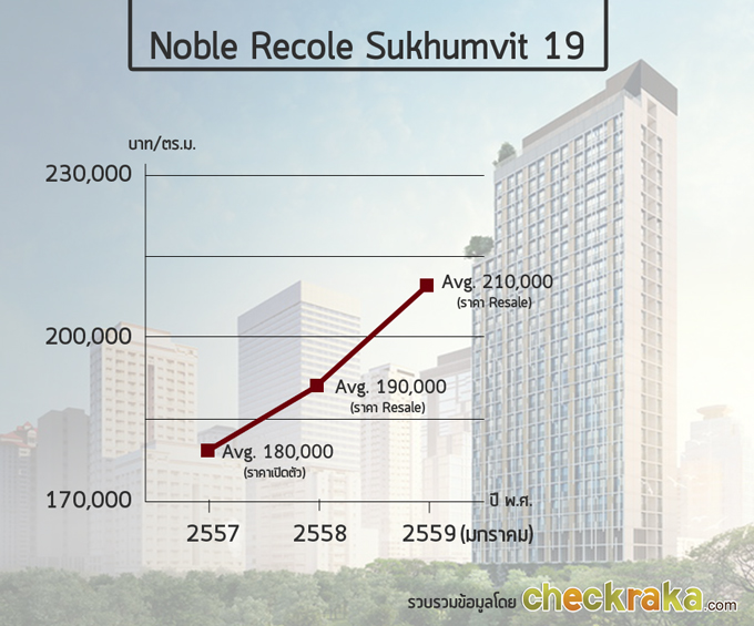 เมื่อเวลาผ่านไป ตอนนี้ก็หนึ่งปีกว่าๆ แล้ว ราคาในปัจจุบันเท่าที่เราเข้าไปดูจากเว็บไซต์ขายคอนโด Resale จะประกาศขายกันอยู่ที่เฉลี่ยประมาณ 210,000 บาท/ตร.ม. ซึ่งเป็นการเพิ่มขึ้นถึง 16.67% เลยทีเดียว เท่าที่เราได้สอบถามไปทาง Noble Development มา เข้าใจว่าโครงการนี้เป็นที่นิยม Resale กัน และกว่า 40% ของคนที่ซื้อมือหนึ่งไปตอนแรกก็นำมาขาย Resale กันต่อร่ำรวยกันไปตามๆ กัน เพราะนักเก็งกำไรมองว่าโครงการเหล่านี้มีศักยภาพที่จะเกิด Price Appreciation และสร้างกำไรให้นักเก็งกำไรได้ค่ะ