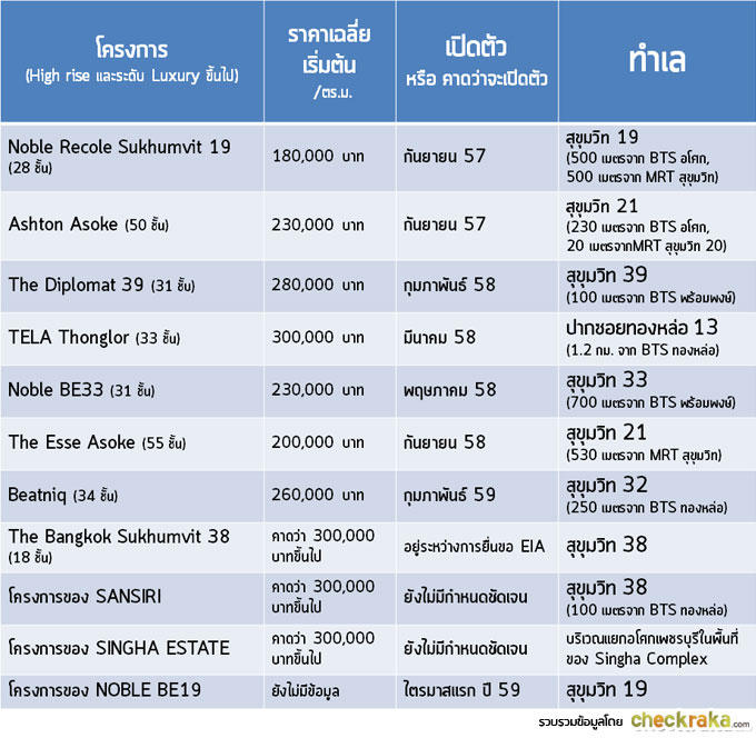 "แพงเกินไปแล้ว!!" "ใครจะซื้อเนี่ย?" รับรองได้ว่าคำอุทานพวกนี้เป็นสิ่งที่เราได้ยินกันบ่อยๆ เวลาเราพูดถึงราคาคอนโดใหม่ๆ ย่านสุขุมวิทค่ะ (ไม่เกินเอกมัย) วันนี้ Checkraka.com เลยรวบรวมราคาเปิดตัวของคอนโด High-Rise (ในระดับ Luxury ขึ้นไป) ที่อยู่ในย่านสุขุมวิทช่วงอโศกถึงเอกมัยในปี 57-59 มาให้ดูกันค่ะว่าตอนนี้ราคาวิ่งกันไปถึงไหนแล้ว และถ้าปี 2559 นี้ พวกเราอยากมองหาซื้อคอนโดใหม่ในสุขุมวิทบริเวณเหล่านี้ ทำเลไหนที่ Checkraka มองว่ายังน่าสนใจค่ะ?