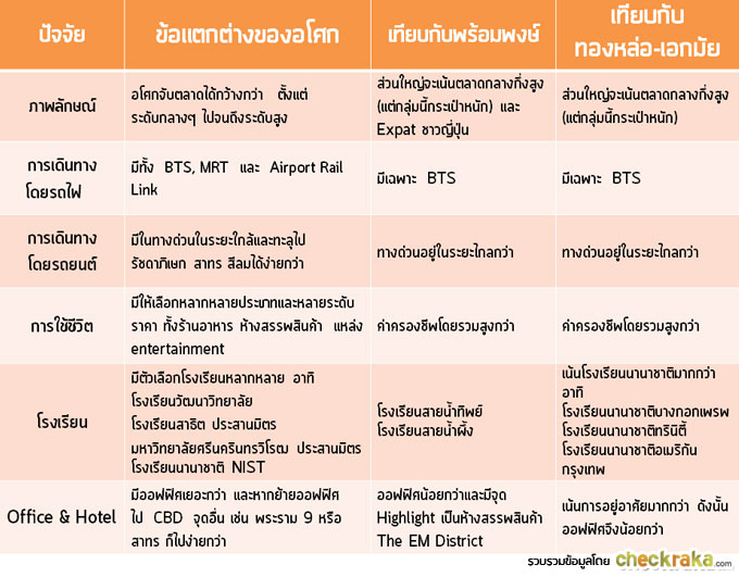 ข้อสังเกตอย่างหนึ่งที่เราเห็นคือ คอนโดที่เปิดเร็ว ขายหมดเร็ว หลายๆ โครงการอยู่แถว "อโศก" แต่ทาง Checkraka คิดว่าก็มีหลายเหตุผลที่ทำให้อโศกน่าสนใจ ในมุมมองของทีมงาน Checkraka หากแยกเรื่อง "รสนิยม" หรือ "ภาพลักษณ์ความหรูหรา" ออกไปก่อน เรามองว่าทำเล "อโศก" เป็นทำเลที่น่าสนใจสำหรับการลงทุน 2 เหตุผลหลักๆ คือ อโศกเป็นย่าน กลางๆ ไม่มีอะไรที่มากเกินไปหรือน้อยเกินไป เป็นย่านธุรกิจที่สำคัญ ซึ่งเป็นที่รวมของบริษัทชั้นนำต่างชาติมากมาย มีความพอดีๆ ในหลายๆ เรื่อง ตัวอย่างเช่น ไม่ฝรั่งจ๋าเกินไป (เหมือนย่านนานา) ยังไม่แพงเกินไป (สุขุมวิท 39) และเป็นทำเลที่มีการกระจายตัวของคนในทุกระดับชั้นทั้งไทย และต่างชาติมากกว่าทำเลอื่นๆ ครอบคลุมทุก Gen ตั้งแต่ C, X, Y, Z และ Baby Boomer (ทองหล่ออาจมีการกระจุกตัวของคนบาง Gen เท่านั้น) และเหตุผลหลักอีกอย่างคือเป็น Hub of Bangkok Connection มีการคมนาคมครบถ้วนที่สุด (มีทั้งทางด่วน, BTS, MRT และ Airport Rail Link) รวมถึงอยู่ตรงกลาง ง่ายต่อการไปสุขุมวิทช่วงต้น สุขุมวิทช่วงกลาง รัชดาภิเษก รวมถึงไปสาทร หรือสีลมก็ได้ สำหรับนอกเมืองหรือต่างจังหวัดก็มีทางด่วนที่ไปได้หลายทิศ เช่น ด่านท่าเรือและพระราม 4 (ประมาณ 2.5 กิโลเมตรจากแยกอโศก) ไปพัทยา-ชลบุรีได้ หรือด่านอโศก 2 (ประมาณ 1.8 กิโลเมตรจากแยกอโศก) ก็ไปสุวรรณภูมิ รามอินทรา มอร์เตอร์เวย์ได้