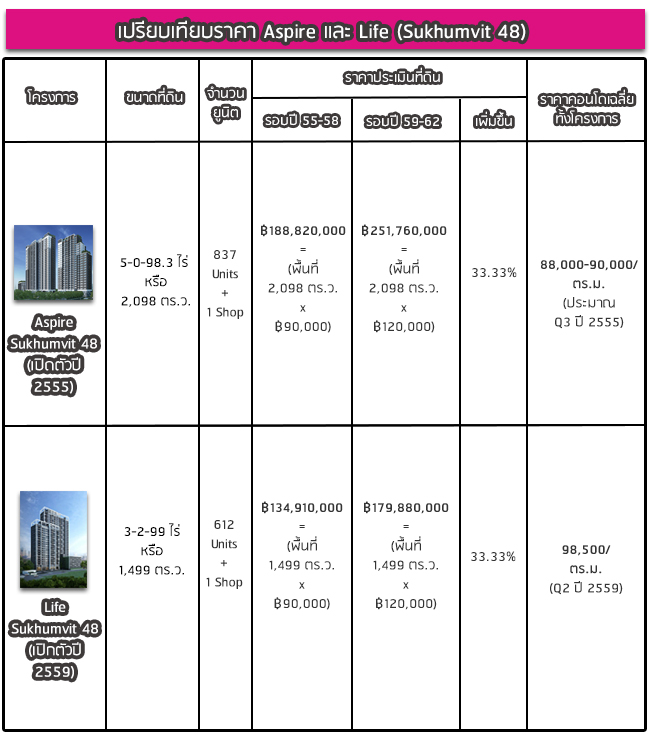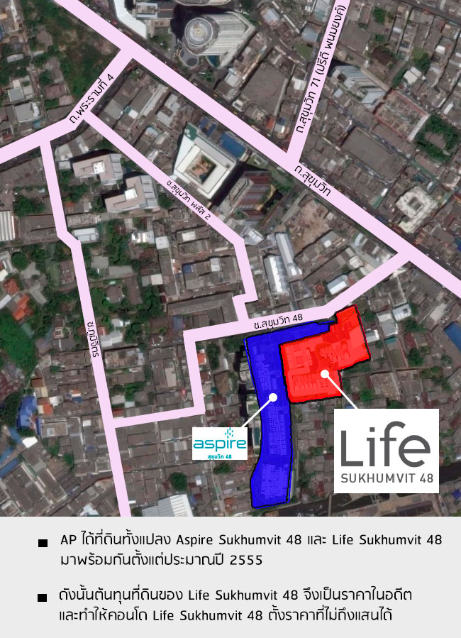 ตารางข้างล่างแสดงในเห็นถึงมูลค่าของที่ดินของโครงการ Life Sukhumvit 48 และ Aspire Sukhumvit 48 ซึ่ง AP ได้เก็บไว้ตั้งแต่อดีต โดย AP แทบจะตั้งราคา Life Sukhumvit 48 เท่ากับราคาของ Aspire Sukhumvit 48 เมื่อ 4 ปีที่แล้วเลย