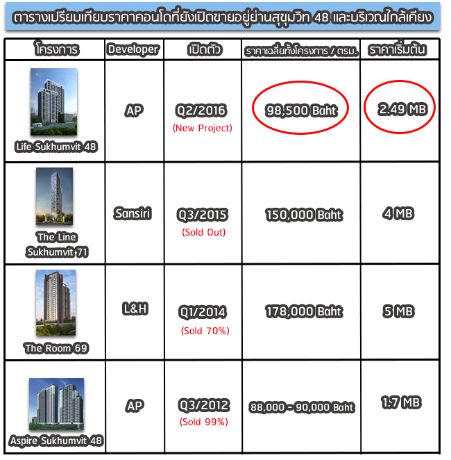 มองกันในแง่การลงทุน เมื่อเทียบกับโครงการอื่นๆ ในย่านเดียวกัน Life Sukhumvit 48 จะได้เปรียบในเรื่องของราคาที่มีความคุ้มค่า ทั้ง Real Demand และ Investor ทั้งระยะสั้น และระยะยาว ซึ่งหากมองจากตารางด้านล่างนี้ จะเห็นได้ว่า Life Sukhumvit 48 มีราคาต่อตร.ม. เฉลี่ยที่ 98,500 บาทเท่านั้น ในขณะที่หลายๆ โครงการได้ขยับไปถึง 150,000-170,000 บาทต่อตารางเมตรกันแล้วค่ะ เชื่อเหลือเกินว่าทำเลแถวพระโขนงนี้มาแน่ๆ ยิ่งถ้าเป็นอีกสัก 3-4 ปีข้างหน้า ราคาแถวนี้คงสูงขึ้นกว่านี้มาก