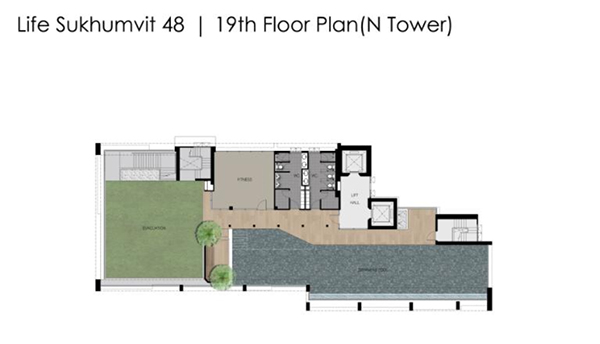Rooftop Facility ของ ชั้น 19 (อาคาร North) มีสระว่ายน้ำ, ฟิตเนส และพื้นที่สีเขียวเช่นกันค่ะ