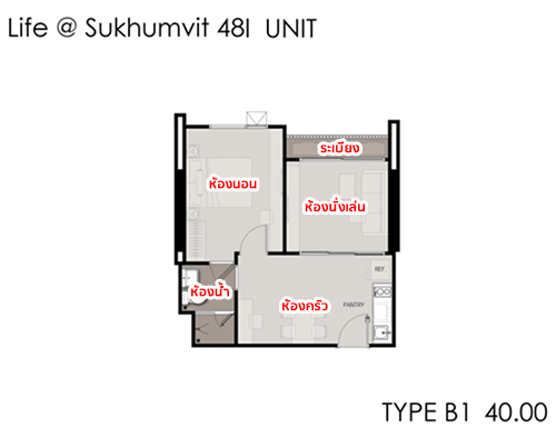 Unit Type ขนาด 40 ตร.ม. แบบ 1 ห้องนอน 1 ห้องนั่งเล่น (แยกส่วน)