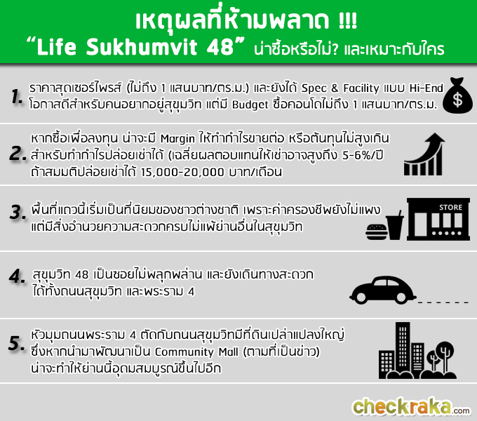 หากดูจากโครงการคอนโดต่างๆ ที่อยู่ใกล้ๆ กับ BTS พระโขนง ในระยะไม่เกิน 1-2 กิโลเมตร ก็จะเห็นได้ว่ามีตัวเลือกอยู่หลายโครงการ แต่ส่วนมากมักจะมีราคาเฉลี่ยต่อตารางเมตรที่เกิน 100,000-150,000 บาทต่อตารางเมตรกันไปหมดแล้วค่ะ ส่วนโครงการที่เหลือก็ Sold Out กันไปหมดแล้ว จึงทำให้ Supply ไม่พอกับ Demand ที่จะเกิดขึ้นอย่างมากในย่านนี้อย่างแน่นอน มีโอกาสได้ Upside Gain มาก หากในอนาคตมีโครงการใหม่ๆ เกิดขึ้น ก็น่าจะไม่สามารถที่จะขายในราคาเฉลี่ยต่ำกว่าแสนอย่างที่ Life Sukhumvit 48 ทำได้ค่ะ
