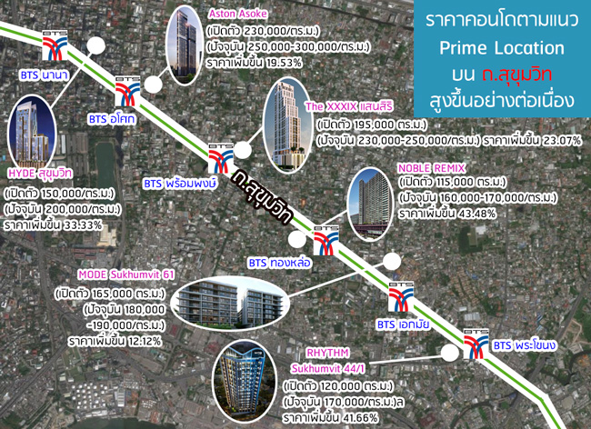 สอดคล้องกับราคาที่ดิน ราคาคอนโดต่างๆ ตามแนว Prime Location บนถ.สุขุมวิท ก็สูงขึ้นอย่างต่อเนื่อง