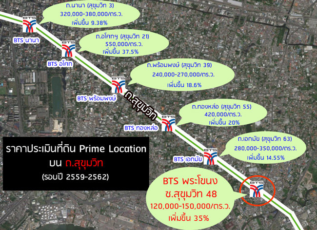 ราคาประเมินที่ดินบน Prime Location ตามแนวรถไฟฟ้า BTS บนถ.สุขุมวิท ก็เพิ่มขึ้นอย่างต่อเนื่อง