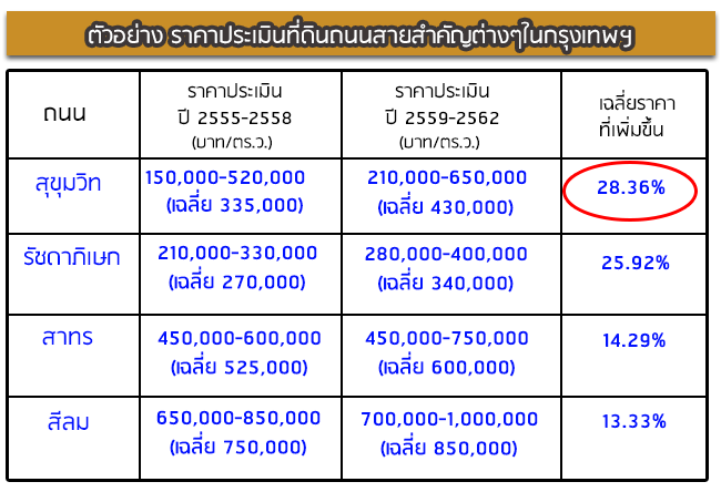 จากการปรับราคาประเมินที่ดินครั้งล่าสุด ปี 2559-2562 ที่ดิน ถ.สุขุมวิทเพิ่มขึ้นเฉลี่ยถึง 28.36% เมื่อเทียบกับ 4 ปีที่แล้ว