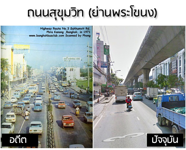 บนถนนสุขุมวิทในย่านพระโขนง (ประมาณ พ.ศ. 2514) บริเวณใกล้ๆ ธนาคารกสิกรไทย สาขาพระโขนง