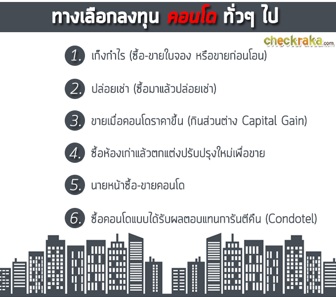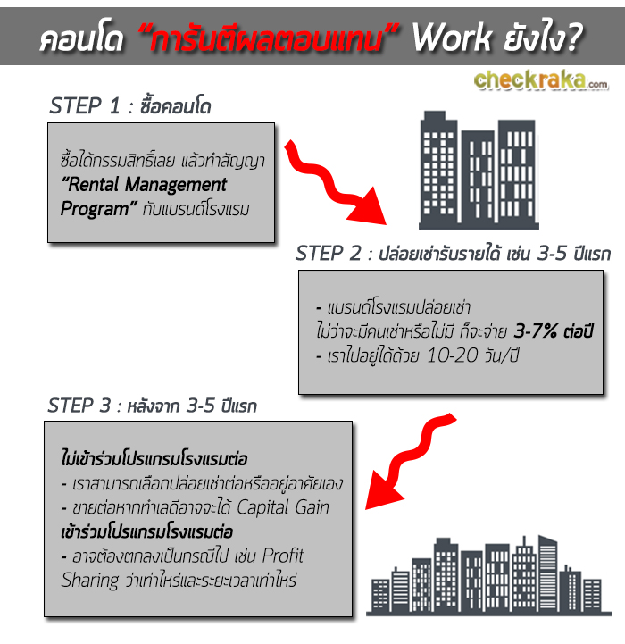 CheckRaka.com คงมีวิธีการลงทุน เพื่อให้เงินทำงานกันในหลากหลายรูปแบบ ซึ่งเหมาะกับความชอบและไลฟ์ไตล์ที่แตกต่างกันของแต่ละคน แต่ในปัจจุบันนี้ ก็มีการลงทุนในอีกรูปแบบหนึ่งที่น่าสนใจ ซึ่งคือ การซื้อคอนโดฯ ที่การันตีผลตอบแทนนั่นเองค่ะ การลงทุนแบบนี้มีรูปแบบเป็นอย่างไร และจะแตกต่างจากการลงทุนแบบอื่นๆ อย่างไรบ้าง เรามาดูกันเลยค่ะ