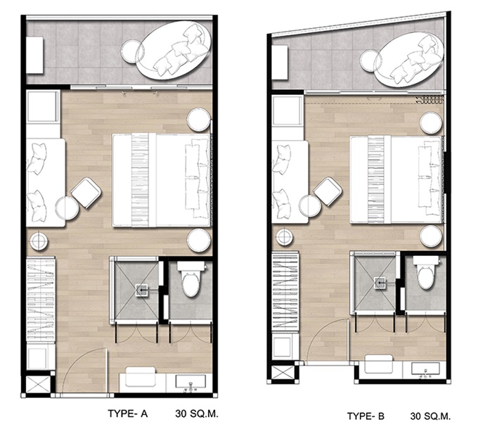สำหรับแบบแปลนห้องนั้นจะมี 6 Type ด้วยกันค่ะ โดยทั้งหมดจะเป็นห้องแบบ Studio แบ่งเป็นห้อง Bay View (วิวชายหาดบางเสร่และหาดจอมเทียน) และ Bay Front ขนาดตั้งแต่ 30 ตร.ม. - 33 ตร.ม.