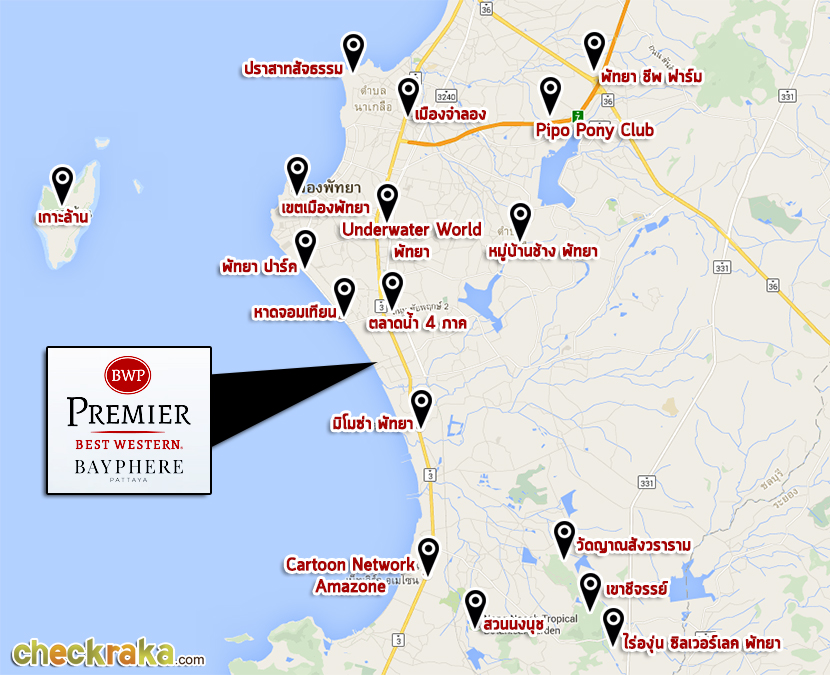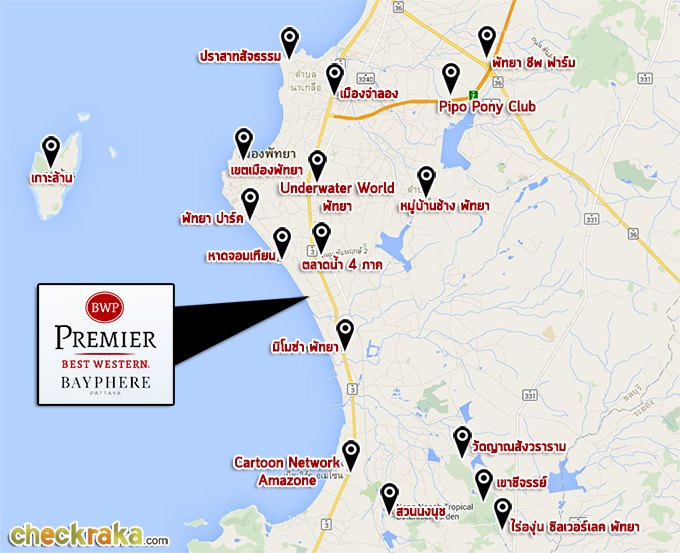 แผนที่แสดงสถานที่ท่องเที่ยวยอดนิยมโดยรอบเมืองพัทยา