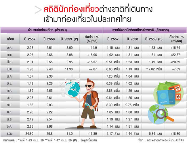 สถิตินักท่องเที่ยวต่างชาติที่เดินทางเข้ามาท่องเที่ยวในประเทศไทย (ข้อมูล ณ เม.ย. 2559)