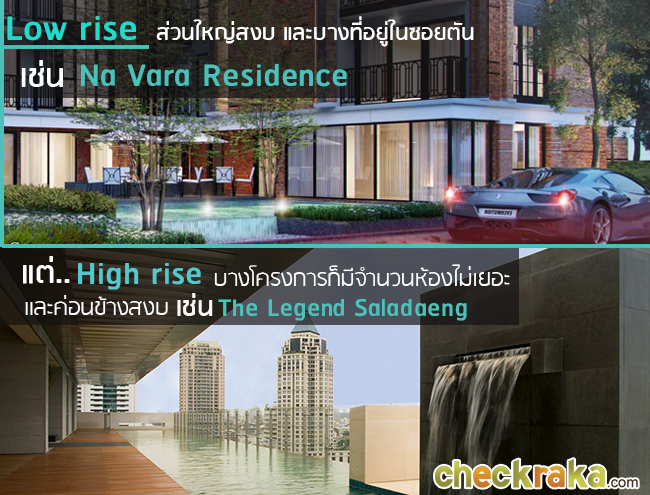 สำหรับบางคนที่ชื่นชอบความเงียบสงบแบบเป็นส่วนตั๊ว... ส่วนตัว ไม่ชอบความวุ่นวาย คนน้อยๆ คือสวรรค์ของคุณ เหตุผลนี้ต้องเทใจไปเลือกคอนโดแบบ Low rise ที่ถึงพื้นที่โดยรวมของโครงการแบบ Low rise อาจจะมีขนาดน้อยกว่า แต่จุดเด่นอย่างหนึ่งที่เห็นได้ชัดคือ โครงการประเภทนี้จะได้เปรียบในเรื่องของความเป็นส่วนตัว เพราะด้วยจำนวนชั้นที่มีไม่มากบังคับให้ 1 อาคาร มีจำนวนยูนิตประมาณเพียงร้อยนิดๆ เมื่อจำนวนยูนิตน้อยจำนวนผู้อาศัยก็ไม่มากตาม ไหนจะเรื่องข้อกำหนดของทำเลที่โครงการ Low rise มักสร้างอยู่ในซอยไม่ได้อยู่ติดถนนใหญ่ ก็เลยมีข้อดีเพิ่มตรงที่ไม่ต้องฟังเสียงดังจากท้องถนนฝุ่นควันมีน้อยและมีความเป็นส่วนตัวมากกว่าคอนโดแบบ High rise ที่มีจำนวนชั้นสูงเฉลี่ยตั้งแต่ 20-40 ชั้น ทำให้จำนวนยูนิตมีมากขึ้นตาม ยกเว้นว่าจะเป็นคอนโด High rise ที่ Exclusive มากๆ บางแห่ง ที่โครงการตั้งใจออกแบบให้มีจำนวนยูนิตต่อชั้นน้อยกว่าปกติ หรือเน้นขายห้องขนาดใหญ่ เพื่อให้ความเป็นส่วนตัวสูง แต่ก็แน่นอนว่าต้องแลกมาด้วยราคาต่อตารางเมตรที่สูงขึ้นตามความ Exclusive เช่นเดียวกันค่ะ