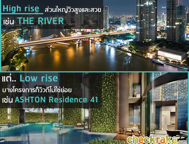 ข้อนี้ต้องถือว่าคอนโดแบบ High rise ส่วนใหญ่จะชนะคอนโด Low rise เพราะความได้เปรียบของการเป็นอาคารสูงทำให้สามารถมองเห็นวิวจากชั้นที่สูงกว่า และมีโอกาสที่อาคารข้างๆ จะบังวิวก็น้อยกว่าคอนโดเตี้ย นอกจากนี้แล้วส่วนใหญ่คอนโดสูงมักมีชื่อ มีจุดขาย หรือจุดเด่นเรื่องวิวเจ๋งๆ อย่างการเป็นคอนโดวิวทะเล วิวแม่น้ำ หรือวิวเมืองแบบเทพๆ เพราะวิวดีๆ ย่อมต้องแลกมาด้วยราคาต้นทุนของที่ดินที่มีมูลค่าสูง ซึ่งแน่นอนการพัฒนาที่ดินที่มีต้นทุนสูงให้ได้กำไรและความคุ้มค่าที่สุด เจ้าของโครงการก็ต้องมุ่งการลงทุนไปเลือกสร้างโครงการคอนโดสูงแบบ High rise มากกว่าพัฒนาโครงการเป็นคอนโดแบบ Low rise แน่นอนค่ะ