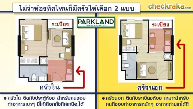 The Parkland Charan - Pinklao เป็นโครงการที่จัด Lay Out ของห้องได้หลากหลาย เกิดประโยชน์สูงสุด และคำนึงถึงความต้องการของผู้อยู่อาศัยแบบละเอียดยิบ ไม่ว่าจะเป็นการใส่ใจเรื่องห้องครัวที่มีทั้งครัวนอกและครัวใน ใครที่ชอบทำอาหารมากก็สามารถเลือกครัวนอกเพื่อความสะดวกกว่า หรือใครไม่เน้นทำอาหารก็เลือกครัวใน พื้นที่ใกล้ระเบียงก็จะกลายเป็นส่วนของพื้นที่นั่งเล่น ดูทีวี เปิดประตูรับลมเย็นๆ ได้ค่ะ นอกจากจะเลือกครัวได้แล้วก็ยังเลือกทิศทางได้อีกด้วย เรียกได้ว่าอยากได้แบบไหนก็แทบจะสั่งได้เหมือนกับออกแบบเองเลยค่ะ