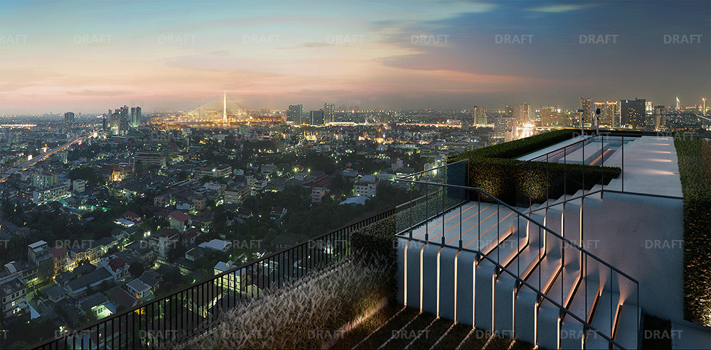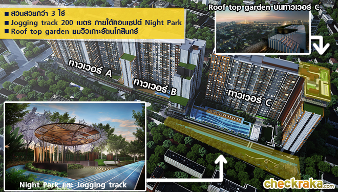 ห้องขนาด 34.5 ตร.ม. แบบ 1 bedroom + Extra เปรียบเทียบกับโครงการใกล้เคียงที่มีห้อง Extra เป็นเรื่องค่อนข้างยากที่พื้นที่ในเมืองจะแบ่งสรรปันส่วนให้เป็นพื้นที่สีเขียวเยอะๆ ได้ ยิ่งกับคอนโดด้วยแล้วยิ่งมองดูยากเข้าไปใหญ่ แต่โครงการนี้จัดเต็มกว่า 3.18 ไร่ มาในรูปแบบ Tropical Landscape+Universal Design บริเวณดาดฟ้าทาวเวอร์ C จะเป็น Roof top garden 360 degree view point มองเห็นวิวสะพานพระราม 8 และมองกว้างๆ เป็นวิวเกาะรัตนโกสินทร์ที่สวยงาม โดยเฉพาะแสงยามค่ำคืน ความมืดจะดันแสงไฟโดยรอบและแสงไฟจากรถที่วิ่งผ่านไปมาบนท้องถนนให้โดดเด่น ภายในสวนก็จะมีสนามเด็กเล่น ลานออกกำลังกาย และดี x2 ไปอีกก็คือ มี Jogging Track ความยาว 200 เมตร ในรูปแบบ Night Park ค่ะ จะเปิดไฟสว่างช่วงกลางคืน เพื่อรองรับผู้อยู่อาศัยที่ไม่มีเวลาออกกำลังกายในเวลากลางวันด้วย