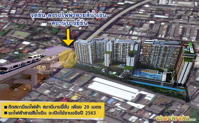 ภาพจำลองบริเวณทางเข้าโครงการและขึ้น - ลง รถไฟฟ้าสถานีบางยี่ขัน - การเดินทางด้วยรถไฟฟ้าสายสีน้ำเงิน เราลองคิดให้ดูเล่นๆ ว่าจากโครงการไปยังสถานที่ต่างๆ โดยรถไฟฟ้านั้น จะใช้ระยะเวลาเท่าไหร่ และไปไหนได้บ้าง