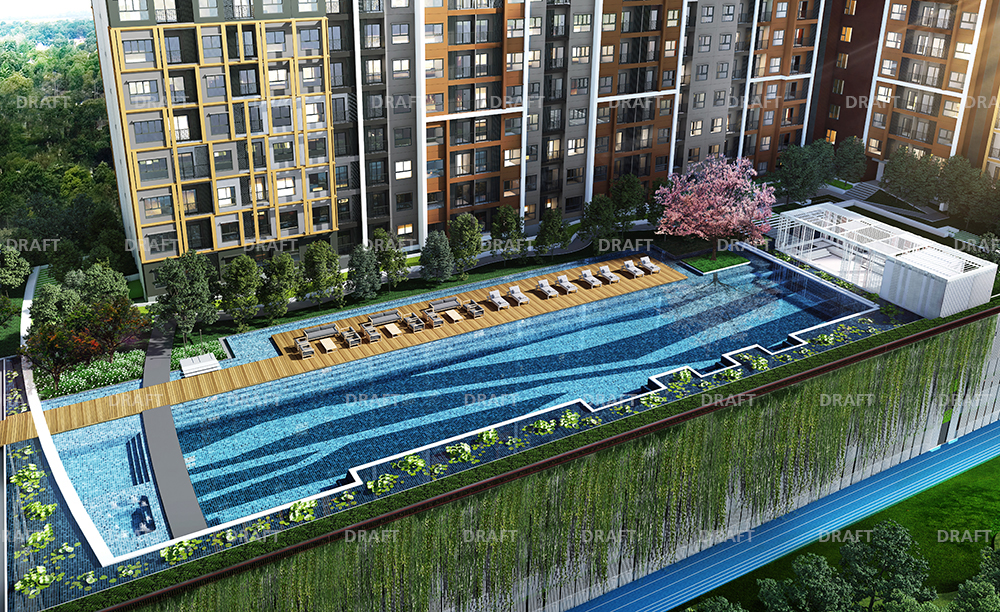 สระว่ายน้ำที่นี่ มีความยาว 50 เมตร กว้าง 12.5 เมตร โดยอยู่บนชั้น 4 ทอดยาวกลางโพเดียมของทาวเวอร์ C มาพร้อม Jacuzzi และสระเด็ก แวดล้อมด้วยต้นใต้สีเขียวสูงต่ำสลับกันไป สอดแทรกสีสันด้วยต้นชมพูพันธ์ทิพย์สีชมพู ซึ่งถือว่าเป็นสวรรค์ของคนชอบว่ายน้ำ ชอบออกกำลังกาย ซึ่งคอนโดที่ให้สระว่ายน้ำยาวถึง 50 เมตรในประเทศไทยมีไม่ถึง 10 ที่ อาทิ Ideo Mobi Sukhumvit Eastgate, Eastern Star หรือ The River ล้วนเป็นคอนโดระดับ Luxury ทั้งนั้น แต่ที่นี่ก็มีสระว่ายน้ำเกือบเท่าสระ Olympic ในราคาที่เอื้อมถึง