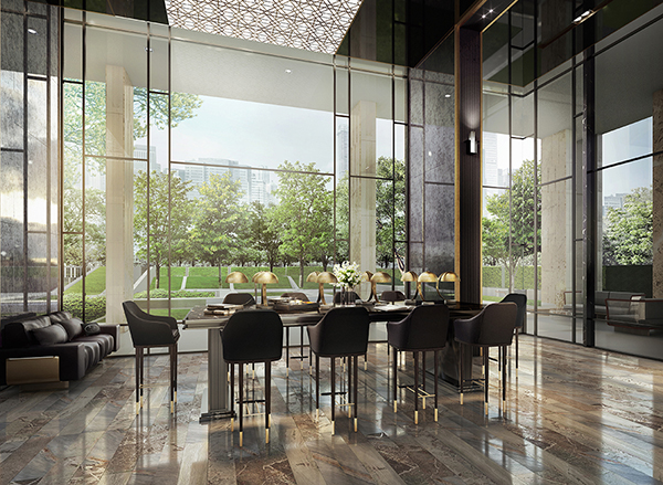 ถัดเข้ามาคือบริเวณ Lobby ชั้น G ดีไซน์ให้ฝ้าเพดานสูง ให้ความรู้สึกโปร่ง โอ่โถง โดดเด่นด้วย Chandelier โดย Fendi Casa แบรนด์เฟอร์นิเจอร์ระดับไฮเอนด์ภายใต้แบรนด์ Fendi ที่เรารู้จักกันดีในฐานะแบรนด์แฟชั่นชั้นนำของโลก รวมทั้งเฟอร์นิเจอร์และของประดับตกแต่งอื่นๆ ในพื้นที่ส่วนกลางล้วนเเล้วแต่เป็นเเบรนด์ Fendi Casa ทั้งสิ้น ถัดมาเป็นห้องสมุดอยู่บริเวณด้านข้าง Lobby มีลักษณะโปร่ง เปิดรับวิวสวนโดยรอบ ทำให้เวลาก่อนหนังสือ หรือนั่งพักผ่อนก็จะมองเห็นพื้นที่สีเขียวโดยรอบ ในขณะที่ภายนอกไม่สามารถมองเห็นด้านในได้ เป็นอีกรายละเอียดที่โครงการใส่ใจ