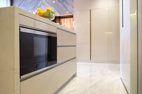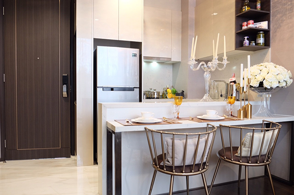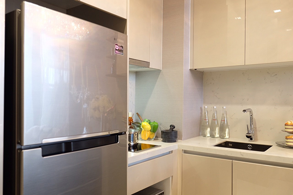 พื้นที่ส่วนแรกคือ ครัว ซึ่งโดยภาพรวมทางโครงการให้วัสดุภาพดีมาให้ อาทิ หน้าบาน High gloss และ Top หิน Quartz รวมทั้ง Kitchen Appliances ที่ครบถ้วน ทั้ง Hob 2 หัว รวมทั้ง Hood ระบบเป่าออกสู่ภายนอกอาคารและ Microwave แบบ Free Standing นอกจากนี้ก๊อกล้างจาน ยังเลือกรุ่นที่มีสายสามารถดึงออกมาสำหรับล้างได้สะดวกยิ่งขึ้นขึ้น และมีพื้นที่มากพอสำหรับเก็บข้าวของเครื่องใช้ในครัว
