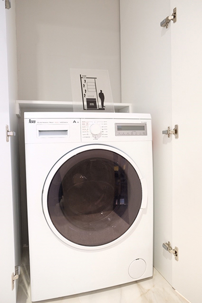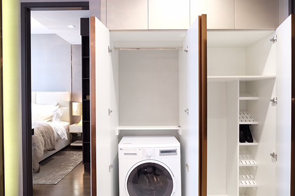 ทางโครงการได้เหลือพื้นที่สำหรับวางตำแหน่งของ ตู้เครื่องซักผ้าและอบผ้าเอาไว้ โดยลดระดับพื้นบริเวณที่วางเครื่องซักผ้า ที่ดีไซน์ให้ซ่อนไว้ในตู้เพื่อให้ดูเป็นระเบียบ พร้อม Floor Drain