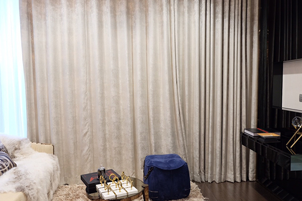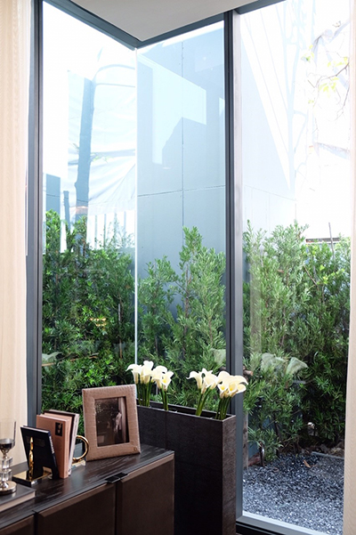 บริเวณ Living Area อยู่ติดกับระเบียงขนาดใหญ่ กั้นด้วยประตูบานเลื่อนกระจกจากพื้นถึงฝ้า 3 เมตร ทำให้ห้องดูโปร่งยิ่งขึ้น เเละยังได้วิวชัดเจนมากขึ้นอีกด้วย ส่วนบริเวณระเบียงกั้นด้วยกระจกนิรภัย ให้ความรู้สึกโปร่งโล่งเช่นกัน