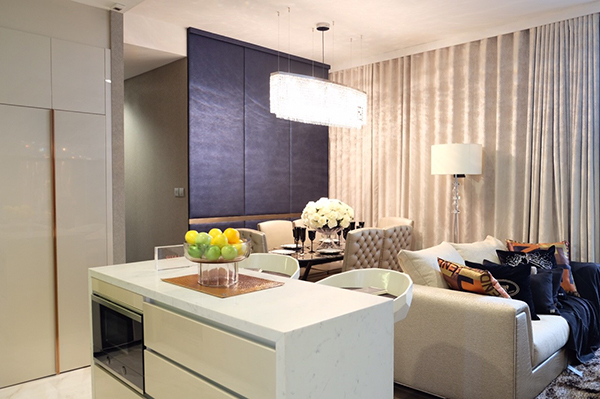 รูปแบบแปลนมีลักษณะหน้ากว้าง ทำให้ห้องดูกว้าง น่าอยู่ พื้นที่ส่วนแรกเป็น Common Area ที่ประกอบไปด้วยบริเวณรับประทานอาหาร Living Area และครัว มาดูที่บริเวณครัว เป็นลักษณะครัวเปิด ประกอบด้วยไอซ์แลนด์ พื้นที่เก็บของวางของอเนกประสงค์ แบบ Soft Close ส่วน Top เป็นหิน Quartz หน้าบาน High gloss รวมทั้ง Kitchen Appliances ที่ครบถ้วน ทั้ง Hob 2 หัว, Hood ระบบเป่าออกสู่ภายนอกอาคารและ Microwave แบบ Free Standing และ Wine Cellar