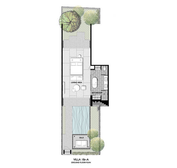 บ้าน Pool Villa 1 ชั้น มี 1 ห้องนอน 1 ห้องน้ำ Layout ห้องจะเป็นรูปทรงสี่เหลี่ยมผืนผ้ายาวลึกเข้าด้านใน