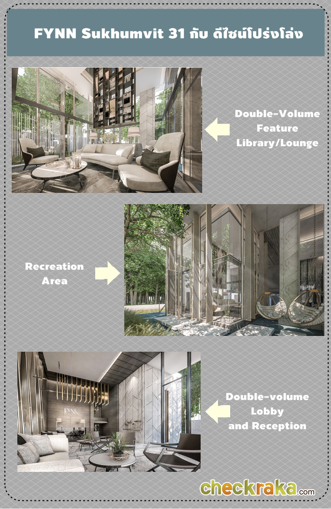 FYNN Sukhumvit 31 มาพร้อมกับดีไซน์โครงการที่โปร่งโล่ง ให้ความรู้สึกที่กว้างสบาย เปิดรับกับแสงธรรมชาติได้อย่างเต็มที่ในทุกๆ พื้นที่โครงการ เพิ่มเติมพื้นที่มากขึ้นด้วย Double-Volume Feature Library/Lounge, Double-volume Lobby and Reception พร้อมกระจกบานใหญ่ กับเพดานห้องที่สูง Floor to ceiling 2.6 เมตร เพิ่มบรรยากาศของความโอ่โถง และทัศนียภาพที่สบายตาได้อย่างลงตัว