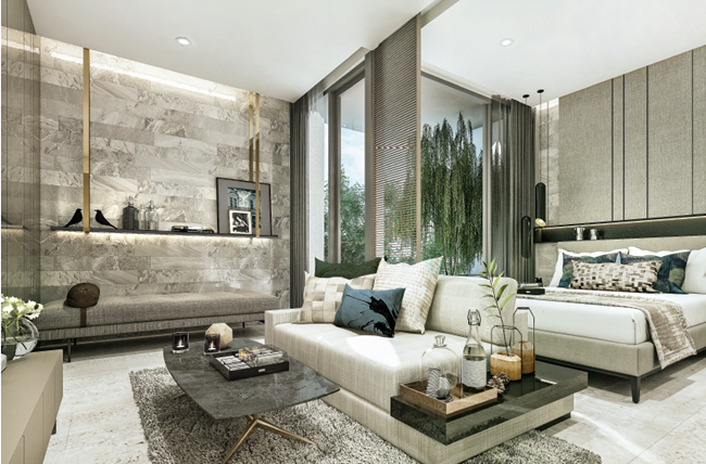 ภาพจำลองบรรยากาศภายในห้องนอน โปร่งโล่งด้วยเพดานสูง Floor to ceiling 2.6 เมตร
