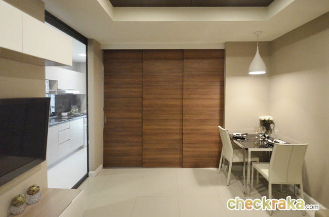 ประตูบานเลื่อนไม้แบบ 3 บานให้เลื่อนเปิด-ปิดกั้นห้องนอนเพื่อเพิ่มความเป็นส่วนตัวที่ทางโครงการเลือกใช้