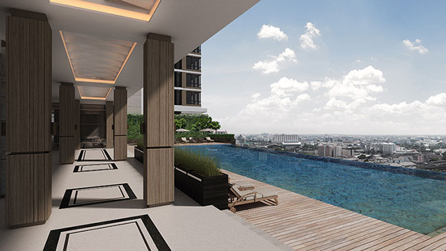 บรรยากาศสระว่ายน้ำ Infinity Edge สวยๆ ที่อาคาร B ขนาด 30 x 12 เมตร ลึก 1.2 เมตร