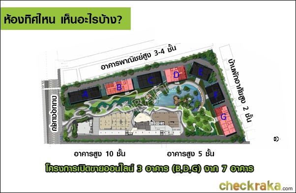 - อาคาร A 23 ชั้น 241 ยูนิต, อาคาร B 25 ชั้น 242 ยูนิต, อาคาร C 30 ชั้น 231 ยูนิต, อาคาร D 33 ชั้น 162 ยูนิต, อาคาร E 35 ชั้น 204 ยูนิต, อาคาร F 33 ชั้น 164 ยูนิต, อาคาร G 25 ชั้น 215 ยูนิต และ ร้านค้า 11 ยูนิต รวมทั้งหมด 1,459 ยูนิต
