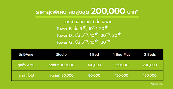 - ห้องชุดพักอาศัย : 1 Bedroom ขนาด 29-45 ตร.ม., และ 2 Bedrooms ขนาด 63-65 ตร.ม.