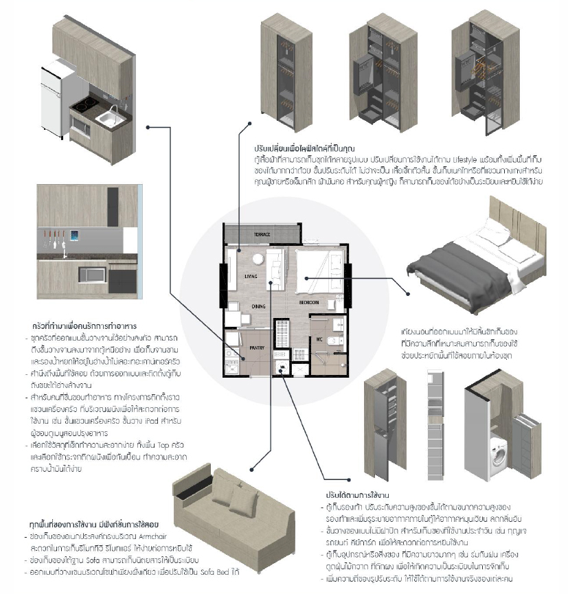 จากแนวคิด Geo fit+ และแตกแขนงออกเป็น 4 หัวข้อแล้ว ทางโครงการก็ได้นำมาพัฒนาออกเป็นเฟอร์นิเจอร์ที่ลูกบ้านใช้ในชีวิตประจำวัน ออกแบบให้ใช้ประโยชน์ได้สูงสุด ใช้พื้นที่ทุกตารางนิ้วให้สามารถใช้งานได้ ไปดูกันค่ะว่าเป็นยังไง