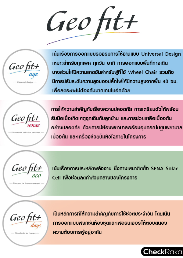 Geo fit+ New Creative Function to FIT your lifestyle นอกเหนือจากการออกแบบพื้นที่ส่วนกลางได้อย่างครบถ้วนและลงตัวแล้ว ทางโครงการยังได้นำแนวคิด "Geo fit+" ที่เป็นการร่วมทุนระหว่างเสนาฯ กับกลุ่มฮันคิว เรียลตี้ หนึ่งในบริษัทอสังหาริมทรัพย์ชั้นนำในประเทศญี่ปุ่น ได้นำแนวคิดในการฟังเสียงลูกค้ามาใช้ในการพัฒนาสินค้า ตรวจสอบโครงการที่ได้รับความนิยม ออกแบบที่พักอาศัยให้เหมาะสมกับ Lifestyle ลูกค้า เพื่อต่อยอดผลิตภัณฑ์ให้ดีขึ้น ซึ่งแบ่งการพัฒนาออกเป็น 4 ข้อ ดังนี้ค่ะ