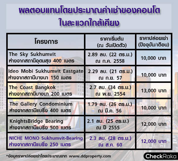 ลงทุนทำเลนี้ คุ้มค่าแน่หรือ? ในแง่ของการ "ชาร์จเงินเข้ากระเป๋า" เราลองเปรียบเทียบดูเล่นๆ สำหรับโครงการคอนโดใกล้เคียงกับ "NICHE MONO Sukhumvit-Bearing" ใน 2 รูปแบบการลงทุน คือ (ก) ถ้าปล่อยเช่า จะได้ค่าตอบแทนเท่าไหร่ (Rental Yield) (ข) ถ้าซื้อมาแต่ไม่ได้ปล่อยเช่า และถือไปเรื่อยๆ ราคาคอนโดจะขึ้นแค่ไหน (Capital Gain)