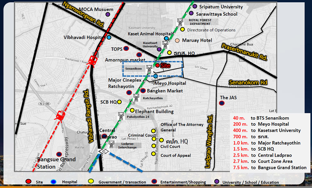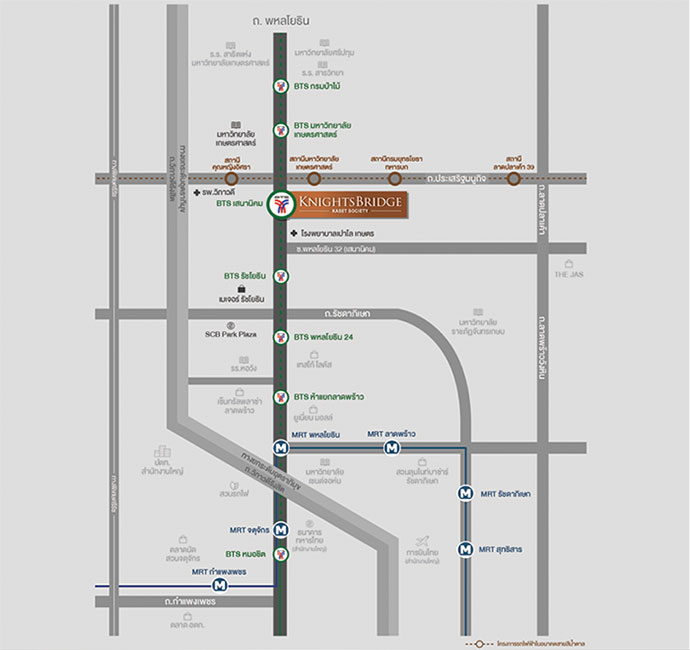 Knightsbridge Kaset Society อยู่ใกล้โรงพยาบาลเมโยและแยกเกษตร ไม่ไกลจากมหาวิทยาลัยเกษตรศาสตร์ บางเขน และอยู่ใกล้รถไฟฟ้า BTS สถานีเสนานิคมเพียง 40 ม. เท่านั้น