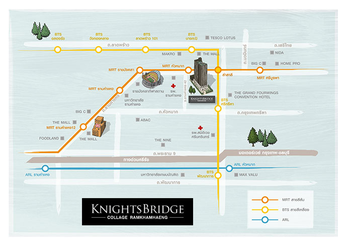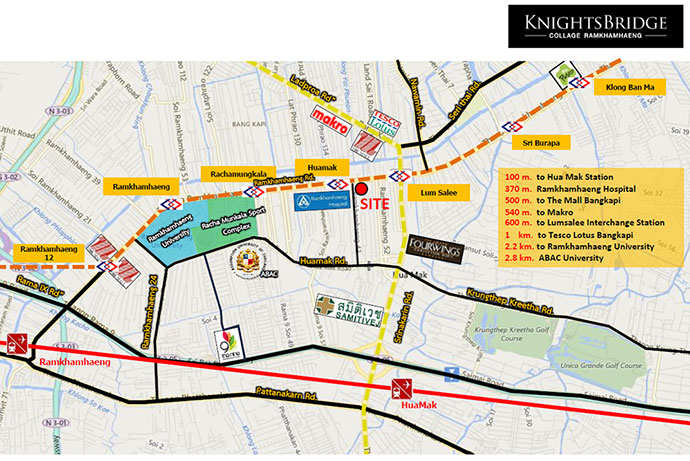 Knightsbridge Collage Ramkhamhaeng ตั้งอยู่ติดถนนรามคำแหง ปากซอยรามคำแหง 42 เพียง 100 ม. จาก MRT หัวหมาก (ส่วนต่อขยายสายสีส้ม) และ 600 ม. จาก BTS ลำสาลี (Interchange สายสีเหลืองและสายสีส้ม)
