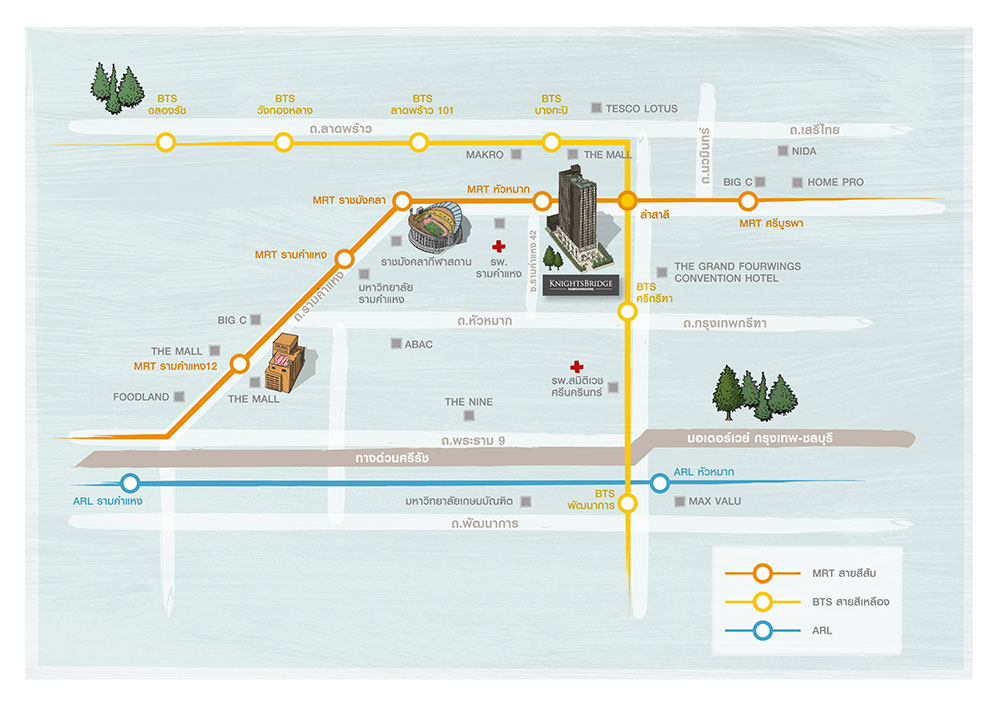 - ติดถนนรามคำแหง 100 ม. จากสถานีหัวหมาก ใกล้สถานี Interchange ลำสาลี