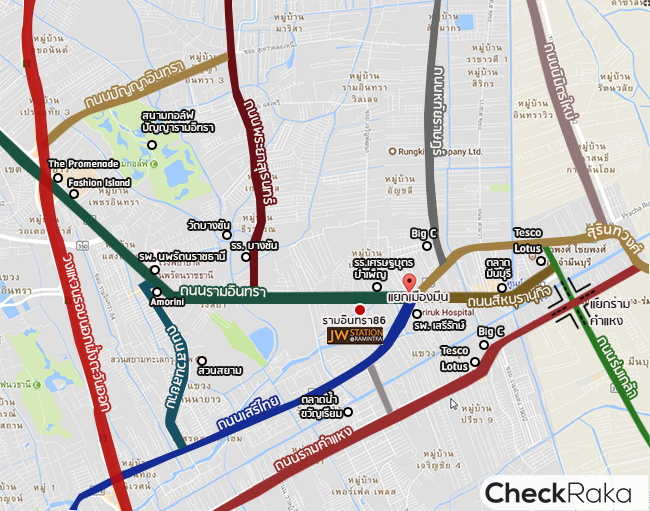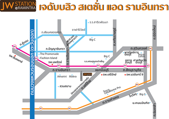 นอกจากความโดดเด่นในเรื่องทำเลที่อยู่ติดกับรถไฟฟ้าสายสีชมพูแล้ว ตำแหน่งที่ตั้งของโครงการ "JW station @ Ramintra" ยังอยู่ใกล้กับแหล่งไลฟ์สไตล์และสถานที่จำเป็นในการใช้ชีวิตของคนทั่วไป มีครบทั้งห้างฯ ใหญ่ Avenue ดี อาทิ Fashion Island, The Promenade, Amorini มีไฮเปอร์ มาร์เก็ต ชั้นนำ Big C, Tesco Lotus และ Makro ใกล้โรงเรียนโรงพยาบาล แถมถ้าเลยแยกเมืองมีนไปไม่กี่เมตรก็มีตลาดท้องถิ่นที่แสดงถึงความเป็นย่านค้าขายอยู่หลายจุด อย่างตลาดมีนบุรี, จตุจักร 2 เรียกว่าย่านนี้อุดมสมบูรณ์ใช้ชีวิตได้สะดวกสบาย ยิ่งถ้ารถไฟฟ้าสีชมพูสร้างเสร็จการเดินทางจากโครงการไปยังแหล่งไลฟ์สไตล์และสถานที่จำเป็นต่างๆ ในย่านและนอกย่านก็จะยิ่งทำได้ง่ายและประหยัดเวลาได้อีกเยอะ