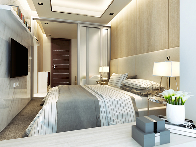 ภาพจำลอง ภายในห้องนอนที่ดูโปร่งโล่งผ่อนคลายกว่าด้วยความสูงจากพื้นจรดฝ้าเพดานถึง 2.7 เมตร