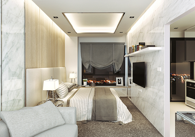 ภาพจำลองห้องนอนพร้อมกระจกกว้างเปิดรับวิวเมืองจากมุมสูง