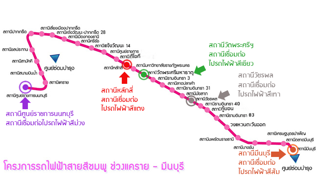 สีชมพู (ช่วงแคราย-มีนบุรี) | รอส่งมอบพื้นที่ระหว่าง ร.ฟ.ม. กับบริษัทเอกชน | - | ธ.ค. 2560 | 2563-2564 |