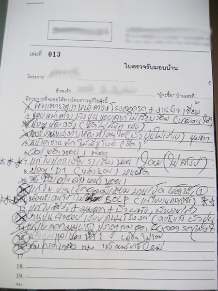 2. อย่าเชื่อเจ้าหน้าที่ - ปกติแล้ว เจ้าหน้าที่โครงการก็อยากให้มีการโอนบ้านให้มากที่สุด เร็วที่สุด และแก้งานน้อยที่สุด ดังนั้นผลประโยชน์ของเจ้าหน้าที่จึงขัดกับเราผู้ซื้อที่ต้องการได้บ้านที่ดีที่สุด ดังนั้น ถ้าเขาพูดอะไรเราคงต้องใช้หลักเหตุผลไตร่ตรองกันอีกทีนะครับ นอกจากนี้ เราควรตรวจสอบรายการแก้ไขที่เจ้าหน้าที่โครงการจดด้วยว่าครบถ้วนถูกต้องหรือไม่ และขอสำเนารายการพวกนี้เก็บไว้สำหรับการตรวจรอบต่อไปด้วย ทางที่ดี หาคนที่พอรู้เรื่องการตรวจรับไปเป็นเพื่อนก็จะดีเพื่อช่วยกันดู ช่วยกันจด และตรวจเช็คความถูกต้องพวกนี้ครับ