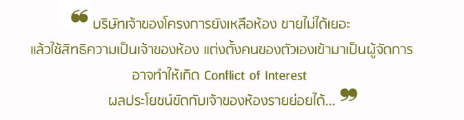 3. เสียสิทธิถอดถอนผู้จัดการที่ไม่ได้เรื่อง - เสียสิทธิในการเลือก หรือถอดถอนผู้จัดการถ้าการประชุมครั้งนั้นๆ มีเรื่องนี้ โดยเฉพาะอย่างยิ่งถ้าเรารู้อยู่แก่ใจว่าผู้จัดการทำหน้าไม่ดี หรือไม่สุจริต (เช่น ทำบัญชีรายรับรายจ่ายที่เป็นเท็จ ไม่ปฏิบัติตามมติคณะกรรมการ หรือตัวอย่างที่เคยเกิดก็เช่น บริษัทเจ้าของโครงการยังเหลือห้องขายไม่ได้เยอะ แล้วใช้สิทธิความเป็นเจ้าของห้อง แต่งตั้งคนของตัวเองเข้ามาเป็นผู้จัดการ ซึ่งอาจทำให้เกิด Conflict of Interest ผลประโยชน์ขัดกับเจ้าของห้องรายย่อยได้ ปัญหาสำคัญในการบริหารงานก็คืออาจเกิดความไม่เป็นกลางว่าจะบริหารงานเพื่อประโยชน์ของเจ้าของร่วมรายย่อย หรือบริษัทเจ้าของโครงการ) ดังนั้น เราควรเข้าประชุมเพื่อใช้สิทธิในการแต่งตั้ง หรือเอาผู้จัดการประเภทนี้ออกไป