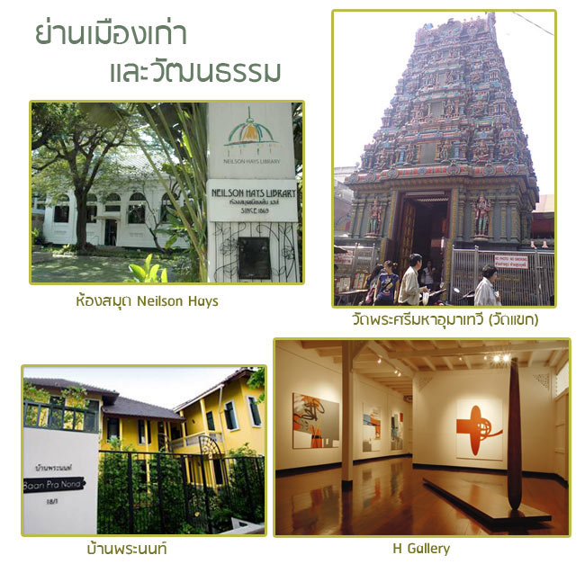 ถนนสีลมเป็นถนนสายแรกๆ ของกรุงเทพ (ร่วมกับถนนเจริญกรุง และถนนหัวลำโพง) จึงยังมีบางอาคาร หรือบางย่านที่ยังคงความเก่าและมีเสน่ห์อยู่ในตัว ตัวอย่างเช่น "ห้องสมุดนีลเซนเฮส์ (Neilson Hays Library)" บนถนนสุรวงศ์เป็นอาคารห้องสมุดคลาสสิกที่สร้างขึ้นเพื่อเป็นอนุสรณ์แห่งความรักของนายแพทย์ ที.เฮวาร์ด ที่มีต่อนางเจนนี่ เนลสัน เฮส์ ที่ถึงแก่กรรมในปี พ.ศ. 2463 ห้องสมุดแห่งนี้มีเจ้าหน้าที่และกรรมการบริหารงานเป็นผู้หญิงทั้งหมด "วัดพระศรีมหาอุมาเทวี (วัดแขก)" เป็นเทวสถานฮินดูที่ตั้งอยู่เลขที่ ๒ ถนนสีลม แขวงสีลม เขตบางรัก กรุงเทพมหานคร สร้างขึ้นเพื่อเป็นสถานที่ถวายการบูชาพระแม่ปารวตี พระชายาของพระศิวะ ผู้มีจิตศรัทธาจึงนิยมไปกราบไหว้บูชา และขอพร โดยเฉพาะอย่างยิ่ง เรื่องความรัก และการขอบุตร "บ้านพระนนท์" บูติคโฮเต็ลซึ่งปรับปรุงมาจากอาคารเก่าอายุกว่า 70 ปีโดยทายาทเจ้าของบ้าน และได้รับพระราชทานรางวัลอนุรักษ์ศิลปสถาปัตยกรรมดีเด่น ประจำปี 2553 จากสมเด็จพระเทพรัตนราชสุดาฯ "H Gallery" บ้านไม้เก่า 2 ชั้นทรงไทย-อังกฤษอายุ 100 กว่าปีในย่านสาทรซอย 12 ถูกดัดแปลงเป็นแกลเลอรี่ที่ก่อตั้งขึ้นโดย H.Ernest Lee ใช้เป็นพื้นที่แสดงงานของศิลปินเอเซียนร่วมสมัย อาทิ ศิลปะร่วมสมัย, งานเพ้นท์, ภาพถ่ายเป็นต้น