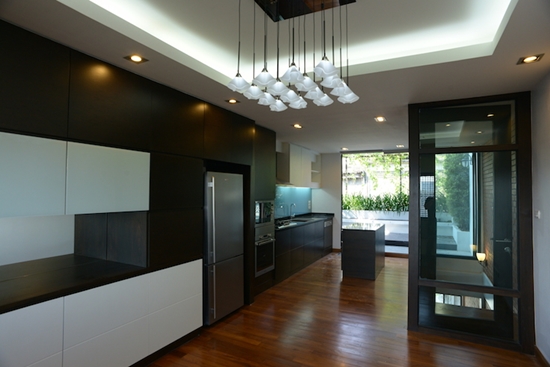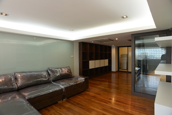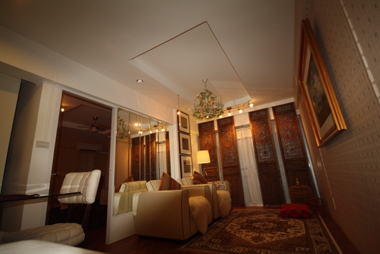 เริ่มกันที่ห้องนั่งเล่นครับ ปูพื้นและเพดานใหม่หมด และมี Pantry ไว้สำหรับอุ่นอาหารหรือชงกาแฟไว้ในส่วนนี้