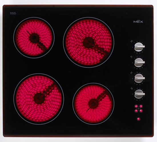 2. เตาไฟฟ้าเซรามิก (Glass Ceramic Hob) เตาไฟฟ้าประเภทนี้จะมีลักษณะเป็นแผ่นกระจกสีดำ ซึ่งกระจกนี้จะสามารถทนความร้อนได้สูง เอาไว้ใช้เป็นตัวกลางนำความร้อนจากขดลวดมาสู่อุปกรณ์ประกอบอาหาร ขณะที่เตาทำงานตรงขดลวดจะมีสีแดงขึ้นมา ข้อควรระวังในการใช้ก็คล้ายๆ กับเตาไฟฟ้าเพลตร้อน คือหลังจากที่ปิดเตา จะยังมีความร้อนหลงเหลืออยู่ อาจทำให้เกิดอันตรายได้